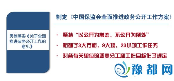 中国保监会根据《关于全面推进政务公开工作的意见》要求,结合《2016年政务公开工作要点》部署的工作任务,从保险监管实际出发,制定了《中国保监会全面推进政务公开工作方案》(以下简称《方案》)。《方案》坚持以公开为常态、不公开为例外的原则,部署了全面深化政务公开、完善公开载体建设、夯实政务公开工作基础共3大方面9个大项23个小项的工作任务,覆盖了保监会政务公开工作的各个方面,并规定了完成时限。《方案》还明确了保障方案落实的有关措施和要求,对各有关单位的职责分工和工作目标作了规定。