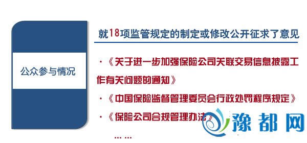 2016年,中国保监会就《关于进一步加强保险公司关联交易信息披露工作有关问题的通知》、《中国保险监督管理委员会行政处罚程序规定》、《保险公司合规管理办法》等18项监管规定的制定或修改向社会公开征求了意见。中国保监会还通过各类互动渠道,听取了保险消费者的意见建议,回应社会关切。