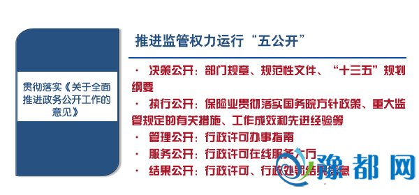 中国保监会努力贯彻《关于全面推进政务公开工作的意见》关于行政权力运行“五公开”的要求,推动监管工作全环节信息公开。一是推进决策公开。所有涉及保险业发展和公众利益的部门规章、规范性文件,在出台前均通过网站公开征求意见。在制定保险业“十三五”规划纲要的过程中,也向社会公开了意见征求邮箱,广泛听取意见。二是推进执行公开。通过网站专题、系列报道等形式,全面展示保险业贯彻落实国务院方针政策、重大监管规定的有关措施、工作成效和先进经验等。三是推进管理公开。系统梳理了保监会行政许可项目的种类、依据、受理机关、审查原则、办理时限等要素并在网站公开,为行政对象提供便利。四是推进服务公开。开通行政许可在线服务大厅,提高办理效率和服务水平,保障行政对象的知情权和监督权。编制优化信访、消费投诉、依申请公开、公文报送等指南信息,简化办事流程,提升服务水平。五是推进结果公开。行政许可、行政处罚等监管权力行使形成的结果信息,均在第一时间对外公开,接受社会监督,促进保险市场健康有序发展。