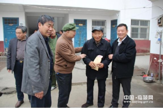 图为全国一级“战斗英雄”海水干(右一),十四军河南战友联谊会会长郭双喜(右三),在王孟镇敬老院,看望慰问英雄李海欣烈士的父亲李银秀。