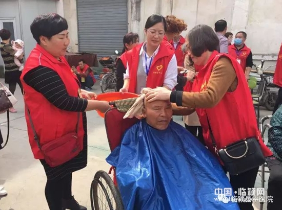 (本网讯 通讯员 刘风明)4月17日,临颍县中医院志愿服务队开展了“走进养老院,关爱老年人"爱心志愿服务活动。图为志愿者在临颍县福康老年公寓为老人义诊、理发等。