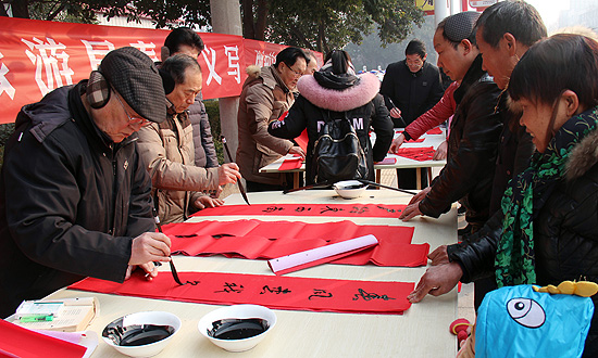 春意暖暖,祝福浓浓。为增添节日文化气氛,为城镇居民送文化大餐,在春节即将来临之际,县文化广电旅游局与县书法协会在县城主要街道联合开展义写春联惠民活动。